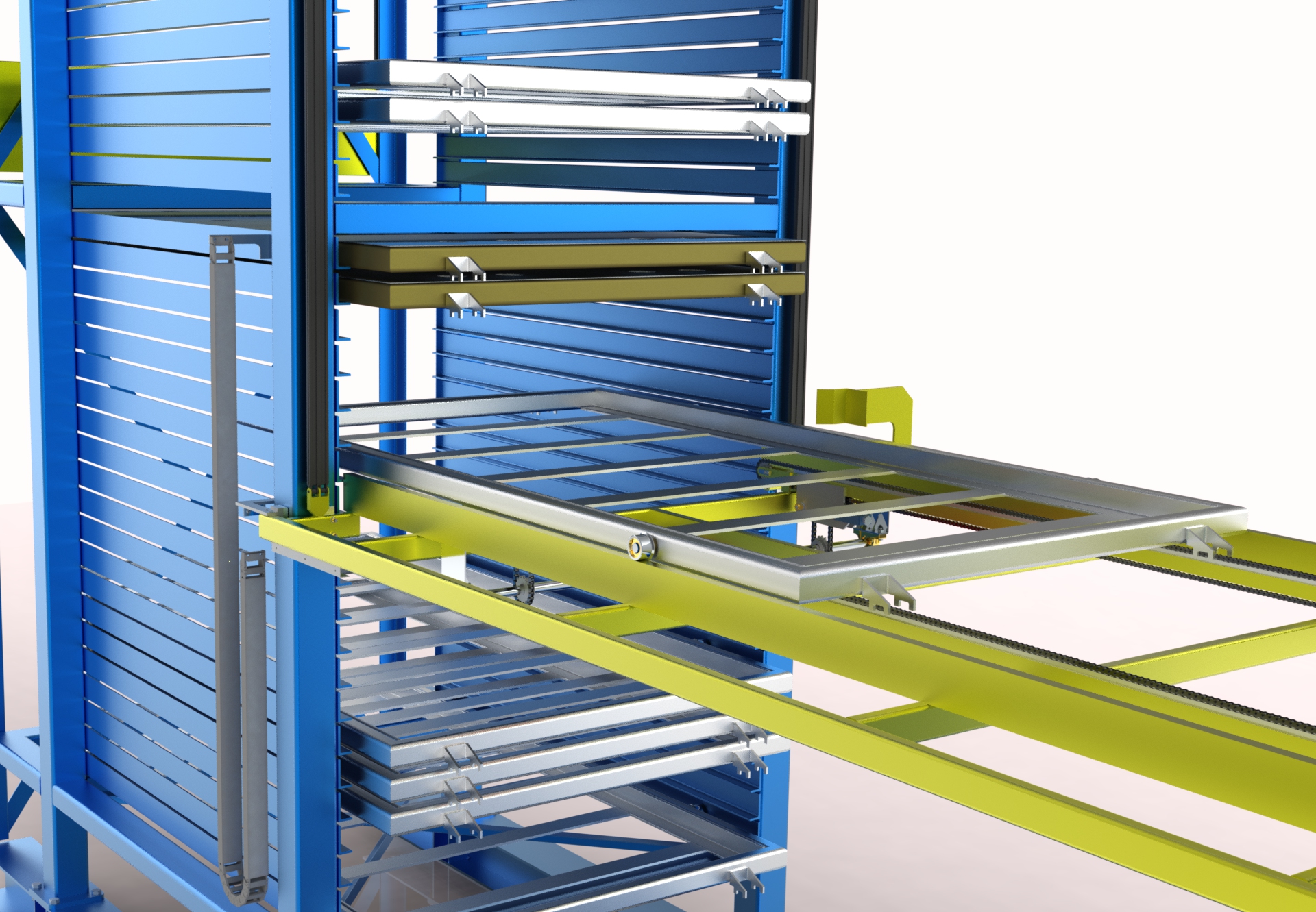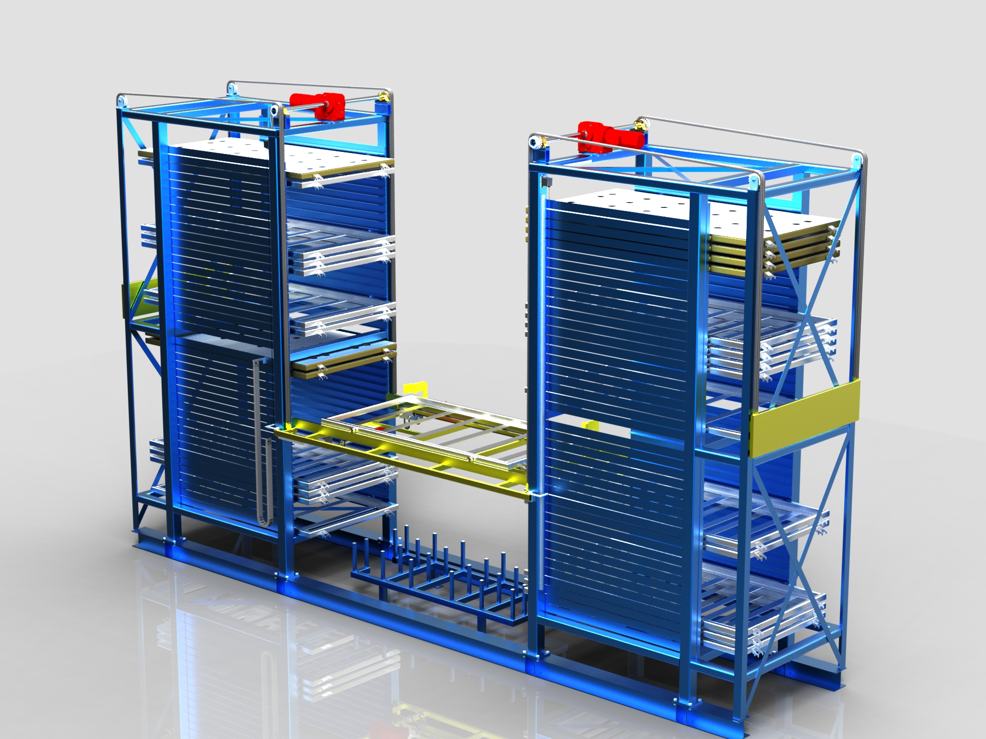 The plate rack is a storage machine designed to store metal sheets. The storage and retrieval of the items is a completely automated process. The plate rack has 84 storage slots with the capacity to store items weighing up to 2.5 tons and measuring up to 3000 x 1500 x 70 per slot. Each slot is provided with a tray which is used to store/retrieve the items. We also performed the Conformitè Europëenne (CE) check to ensure the conformity with the certification criteria.